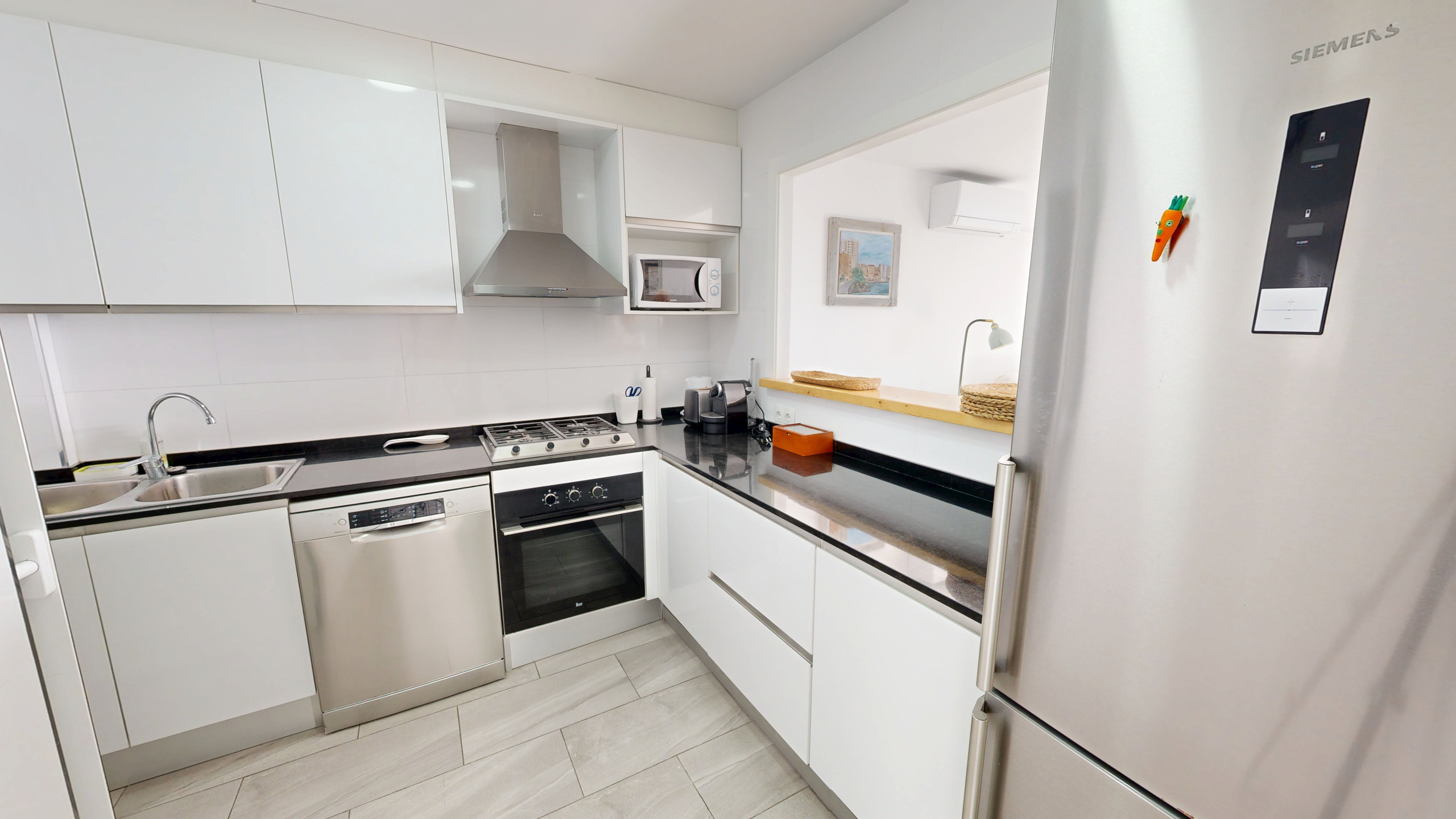 El salón-comedor es muy luminoso y se abre a una agradable terraza con impresionantes vistas al mar, el lugar perfecto para tomar un café con la brisa marina o relajarse al atardecer. La cocina está totalmente equipada, para que puedas sentirte como en casa durante tu estancia.