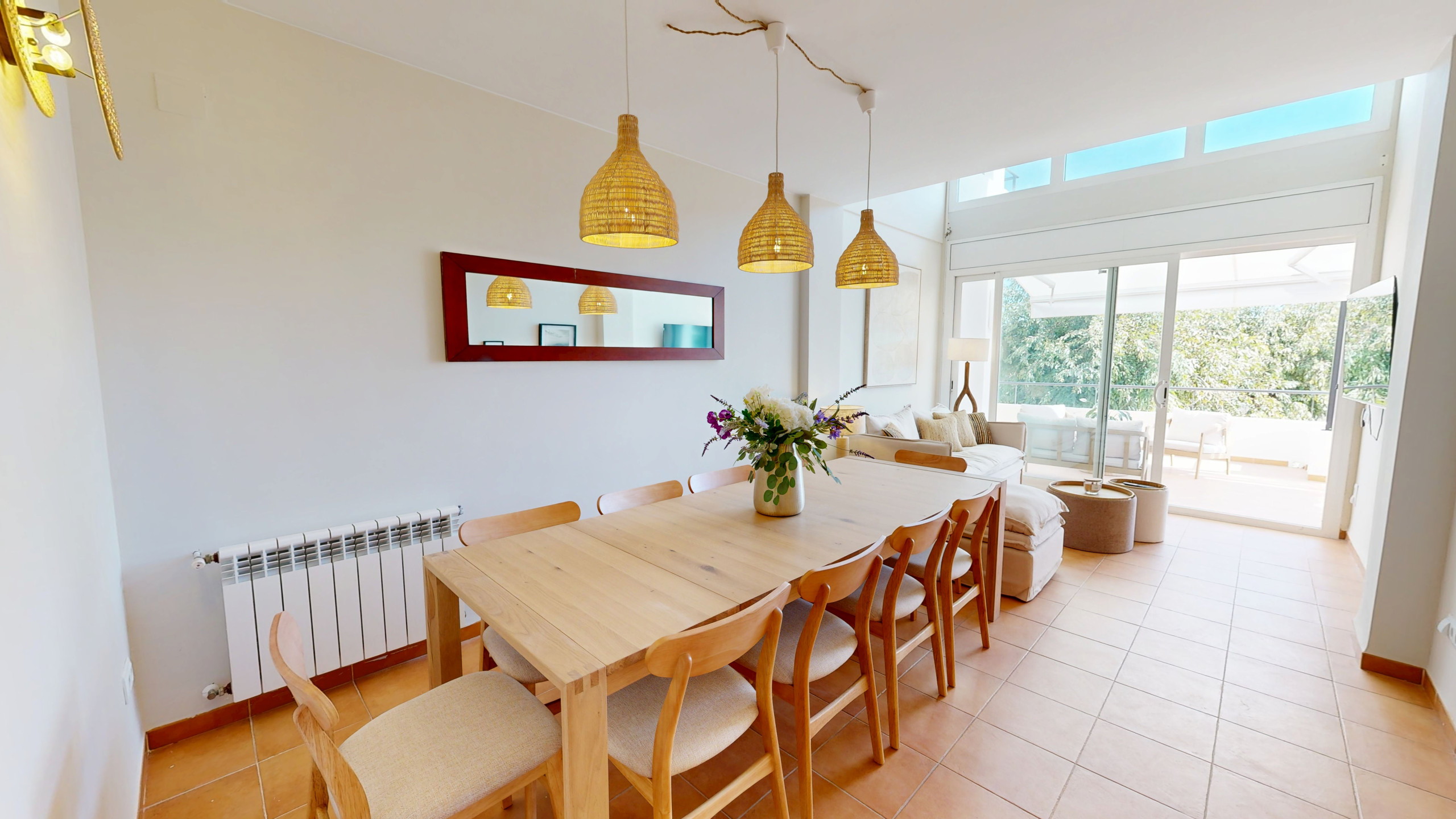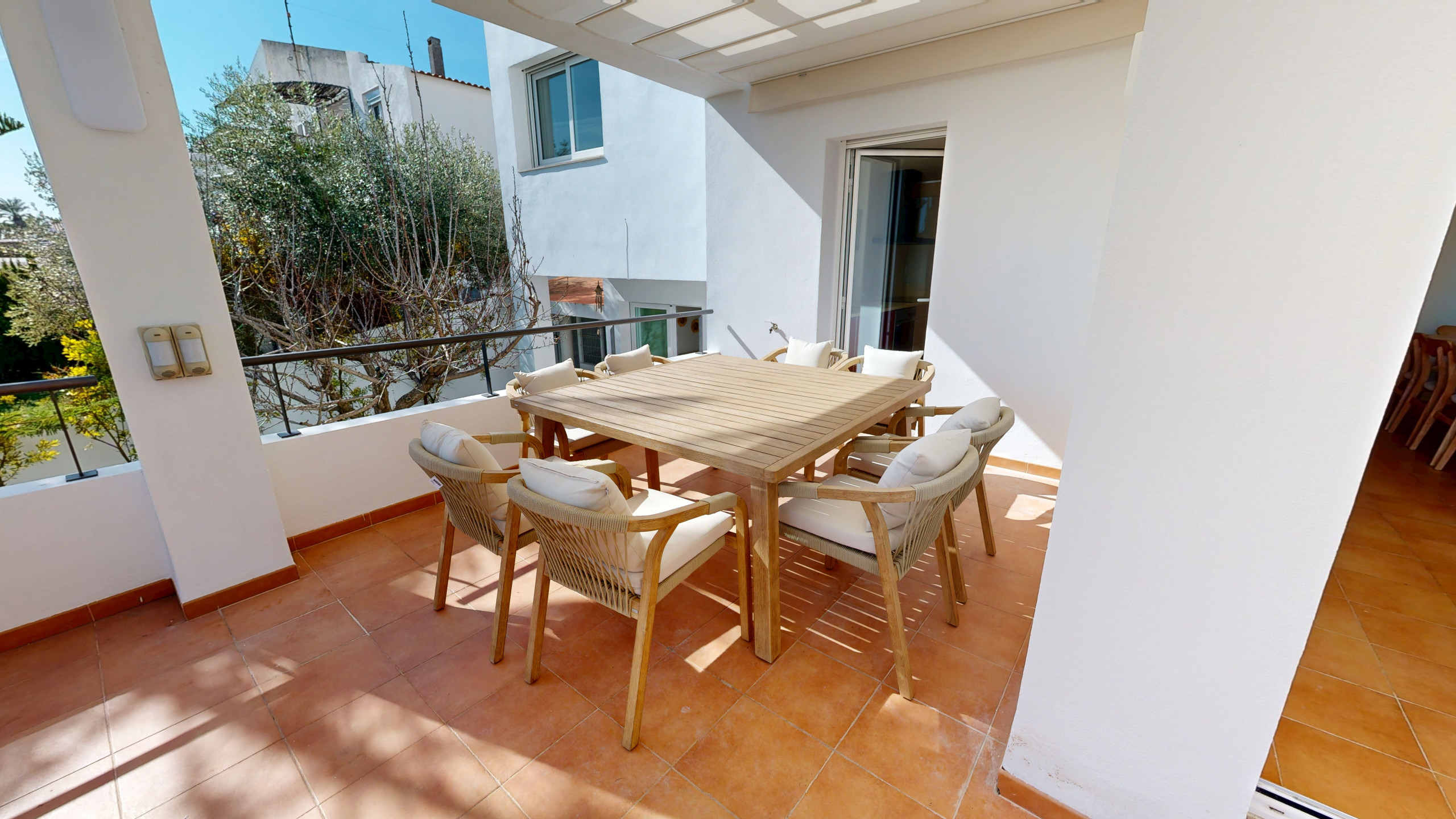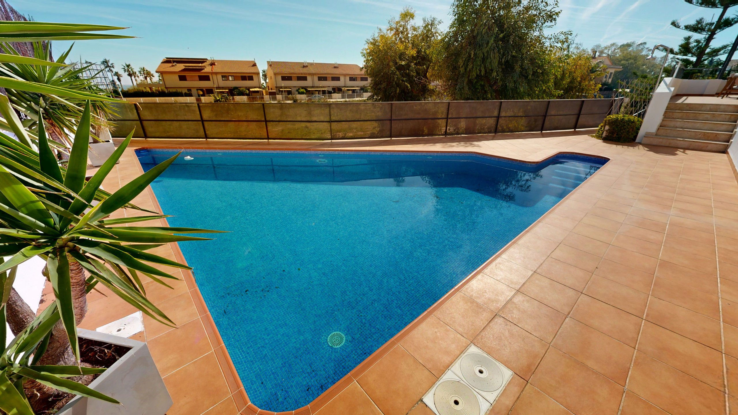 The exterior is one of the property’s main highlights: a beautifully maintained garden, a sea-view terrace with a dining table for al fresco meals, and an elegant triangular swimming pool that adds a distinctive and contemporary touch. Every detail has been designed to embrace the Mediterranean lifestyle in total tranquility.